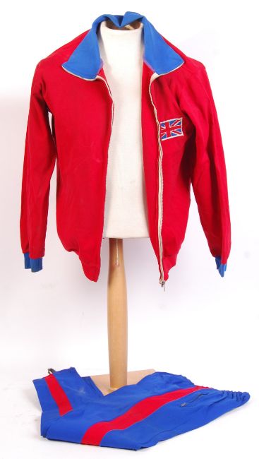 A rare original vintage (1960's / 1970's ) Olympics competitor's tracksuit and trousers trackside uniform. The tracksuit with ' Great Britain ' to reverse and union flag to the breast. Red, with blue cuff decoration. The trousers blue, with red stripe. Makers label for Richard E North. Size not mentioned, but appears Small / Medium. Recipient unknown.