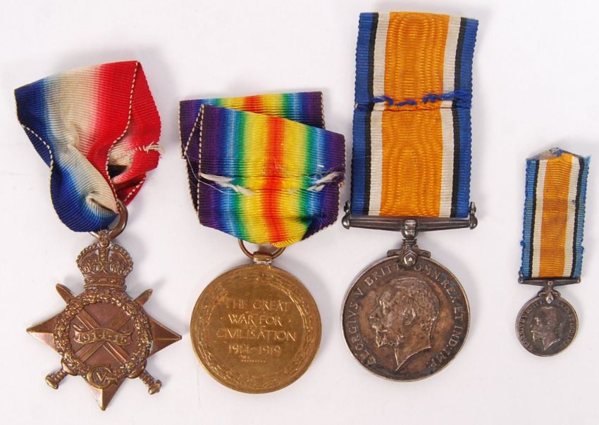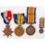 A scarce WWI First World War Irish issue medal trio. Awarded to a Pte HJ Stone 14949 of the Royal Dublin Fusiliers. Comprising War Medal, Victory Medal and 14-15 Star. All with original ribbons. Including a miniature War medal with ribbon. Interesting group.