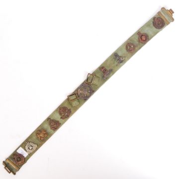 An interesting WWII Second World War ' hate belt ' British regiment cap badge display. Comprising of an original uniform belt, featuring 11x original cap badges - to include RAOC, Highland Regiment, Royal Military Police and others.