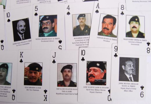 A collection of Second Iraq War (2003-2011) personal effects comprising of; MK6 soldiers combat helmet in desert camouflage with ' 29989062 ' rank number scratched to inner rim,a pack of ' Iraqi Most Wanted ' playing cards with various Iraqi Army officials depicted to include; Mizban Khadr Hadi, Sultan Hashim Ahmad Al-Tai, Minster of Defence, Quasy Saddam Husayn Al- Tikriti, Military Bureau Deputy Chairman & many others, and an Iraqi Twenty Five Dinars bank note, depicting Saddam Hussein.