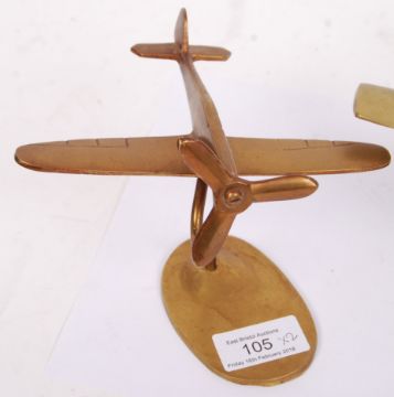 Two brass 20th century aeroplane apprentice pieces. One of a WWII Second World War fighter jet, the other an unknown jet plane. Both measure approx 10cm tall.