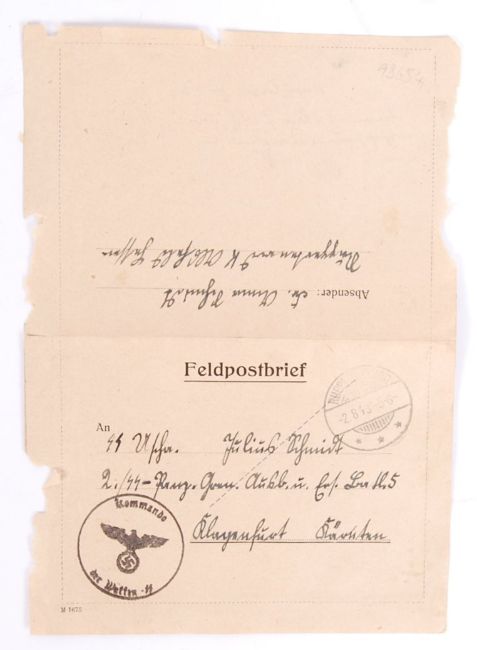An original WWII Second World War Nazi German SS handwritten Fieldpost letter to SS member Julius Schmidt from his wife. Letter with Nazi postal marks to front. With separate written information on Schmidt's background accompanying the letter. Julius Schmidt served in the SS throughout the Second World War & fought in many campaigns to include; The Eastern Front, Tarnopol, Stalingrad & the Warsaw Rising. After the conflicts, he made his way west & was interned by the Americans until 1947.