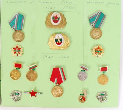 A collection of 1940-1980 Communist Bulgarian epaulettes & badges to include; army officer cap badge, 100th anniversary of the birth of Georgi Dimitrov medal, 30th anniversary of the victory of Germany (1915), sleeve badge, naval badge & others.