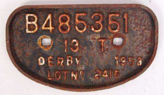 An original vintage 1950's (1953) British Rail (believed)  ' B485351 ' Railway train wagon identification plaque. In black, with raised cast iron lettering in white. Some rusting. Measures approx; 28cm wide.