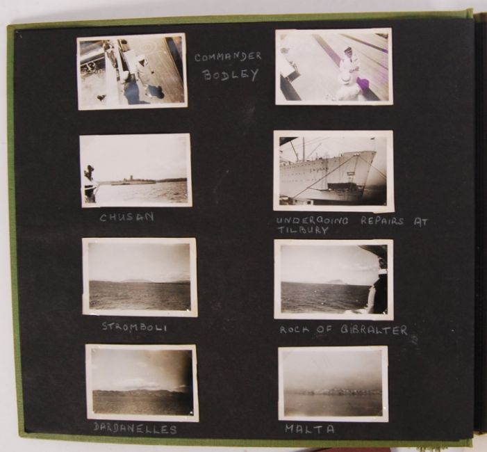 A wonderful 1950's P&O Cruise Line photograph album, filled with personal photographs and related brochures etc pertaining to a cruise on ' Chusan ' in 1953 around the Mediterranean. As the Chusan left London, it has a collision in the Thames Estuary with a merchant ship ' Prospector '. Several personal photographs and newspaper cuttings accompany this story. Also included is a passenger list ( the album relating to a Mrs Pike of Bristol who is listed in the passenger report), menus, related cards and slips etc. Many of the photographs give and interesting insight into a post - WWII Second World War world.