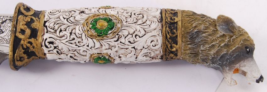 A contemporary 20th century decorative fantasy knife with decorative wooden handle with bears head to top. Measures approx 34cm long.