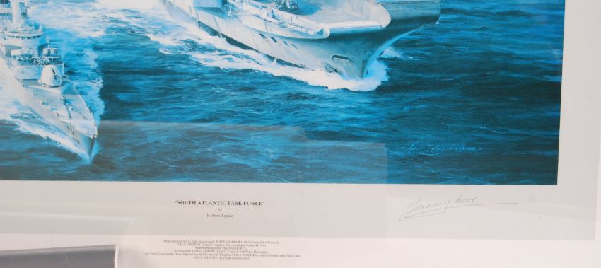 A collection of assorted Robert Taylor (few others) military related prints. Quantity of loose, plus three being framed and glazed. To include; Battle Of Waterloo, HMS Ark Royal, Battle Of The Nile, South Atlantic Task Force and others.