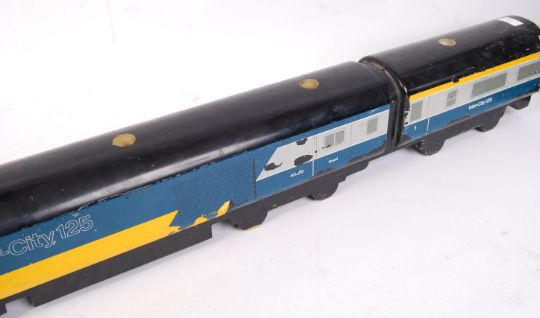 A rare vintage British Railways Information / Ticket Office / Travel Agents InterCity 125 wood and fibreglass display model, Power Car 43070 and quarter of a First Class Coach model. Painted in first issue Inter-City blue, yellow and grey livery, with four holes on roof of train presumably for a banner or leaflets, made by Space Models Ltd, Feltham, Middx, circa 1970s. 100cm in length.