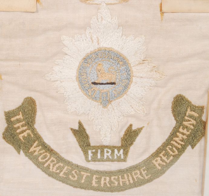 An interesting WWI First World War memorial presentation of items belonging to an Albert Evans of Bristol. Comprising of; 2x black and white photographs of Evans, 2x silk postcards sent home and a large woven embroidery of the ' Worcestershire Regiment ' emblem.  One photograph later inscribed ' Embroidered by Albert Evans while in hospital with his leg off, 1918 First World War .' Consigned by the family, the story goes that whilst advancing on the enemy in 1918 Evans' leg was blown off by an artillery shell, with his company now in front of him, he crawled several miles on his hands until he came across a dirt track where a lone dispatch rider stopped to help him. The dispatch rider was later lambasted for stopping when he was infact on urgent war work.