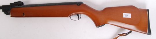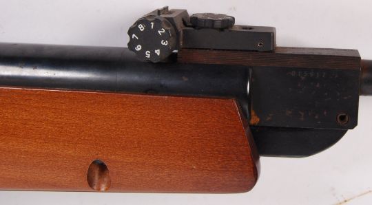An original Webley Vulcan .22 calibre break barrel wooden stock air rifle, with leather shoulder strap. No. 015917. In full working order. Measures approx 111 cm long.