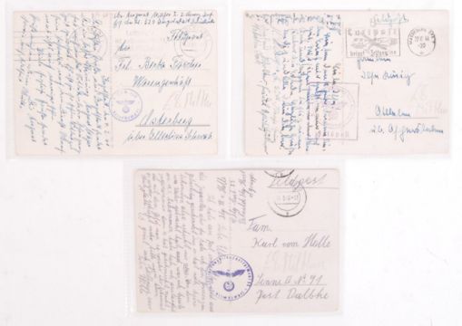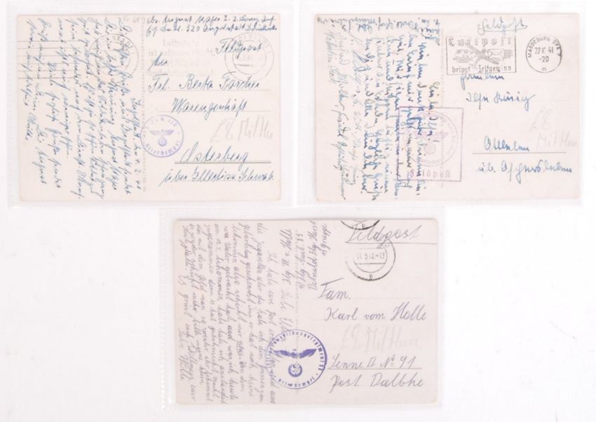 Three Nazi German Third Reich military satirical postcards depicting scenes of; a soldier's birthday party with radio music in the background, soldiers singing & drinking in their living quarters & soldiers washing their uniforms in an outdoor complex. All postcards have handwritten material to reverse, with 1941 & 1942 date. All with official Nazi postal stamps.