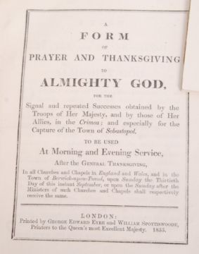 A collection of Crimean War 19th century related ephemera - to include; The Charge Of The Light Brigade at Balaclava - contemporary broadsheet version of part of the poem by Tennyson, illustrated with engraving (uncoloured), three original period engravings of the Crimean War published by Day of London - drawn by W Simpson and lithographed by Picken, Jones & Walker (hand coloured), an Illustrated London News from March 10th 1855 with a Correspondent writing on trench conditions, another Illustrated London News from Oct 30th 1878 which covers the Balaclava Banquet, a special supplement to the Western Flying Post, Sherborne Mercury and Yeovil Times - covering the progress of the war from the battle of Alma to th march on Balaclava and an 1855 Service to celebrate the capture of Sebastopol and success in the Crimea. Interesting collection of related period ephemera.