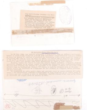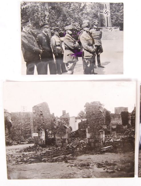 Four original WWII Second World War era newspaper / press photos depicting various scenes throughout the war to include; 2x 1945 dated photos of the church & village where the women & children of the French village of Oradour - Sur - Glane were massacred in reprisal for the killing of soldiers of the SS Das Reich Panzer Division as they were en route to Normandy from the south of France, a 1940 dated photo of French general & German officers preparing to sign the surrender of France & a photo entitled ' Backing Up The Air Lift ' showing a plane at the runway during maintenance which has been trundled out to a waiting Dakota of Operation Plumber. All with various press stamps & information to reverse.