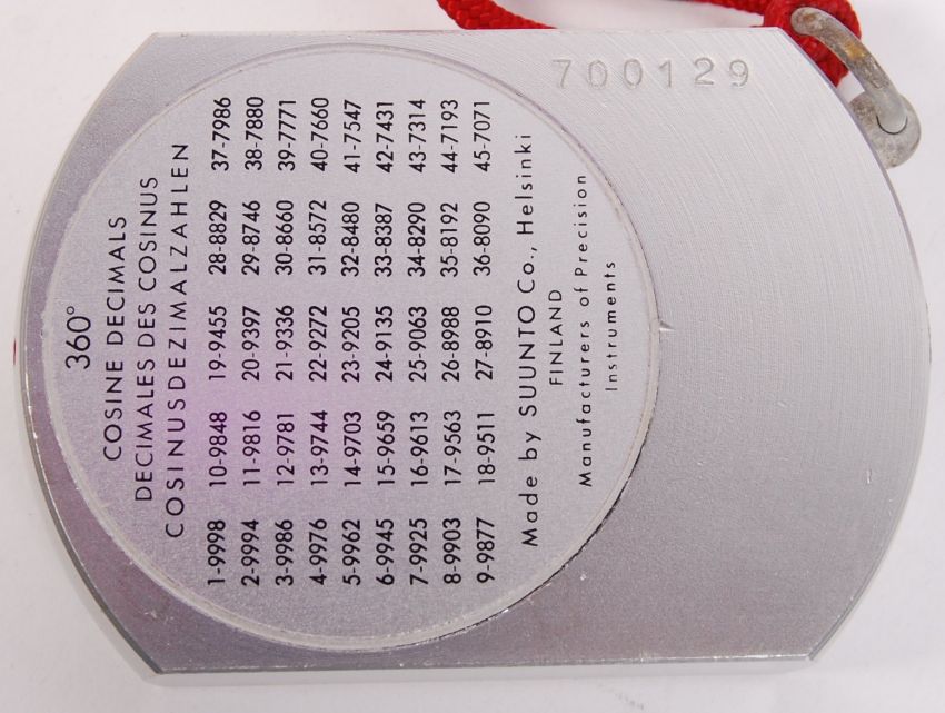 A Sunnto Co. Helsinki, Finland patent block aluminum leather cased Clinometer with neck strap. '700129' marked to reverse.