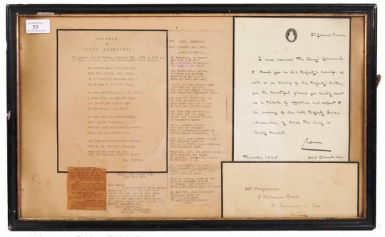 An interesting collection of Royalty memorabilia, all relating to the death of Queen Alexandra in 1925. Comprising of a poem titled ' Requiem to Queen Alexandra ,' by an Amy Haysman, written upon hearing of Queen Alexandra's death, Haysman sent the poem off to St James' Palace, and received a printed response. Also included is a poem that was written by Haysman and presented to Queen Alexandra, and also included is the reply from the Queen's Private Secretary. Everything comes presented in a period frame, along with a newspaper cutting telling of the response from the palace. Measures approx; 36cm x 59cm.
