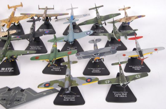 A large collection of approx 18x 1:72 scale Atlas Edition diecast model WWII & other fighter planes to include; Heinkel, Mitsubishi, Hawker Hurricane, North American Mustang & others. All on plastic mounts. All unboxed.