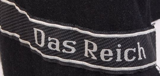A reproduction Nazi German Third Reich SS Schutzstaffel style jacket with various patches & insignia to include; eagle swastika emblem, SS patch, ' Das Reich ' cap tally, various stamps to inner lining & shoulder epaulettes. Size small / medium.