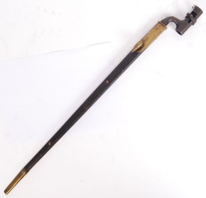 An antique 19th century British pattern 1853 three-band Enfield rifle socket bayonet. Maker marks ' WD ' present to top of blade. Within the original leather scabbard. Measures approx 65cm long.