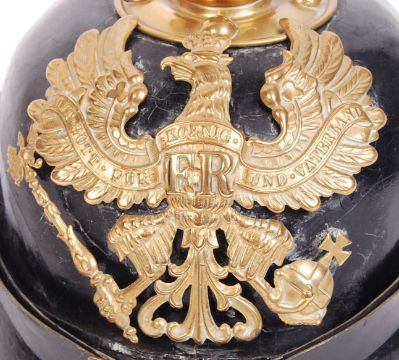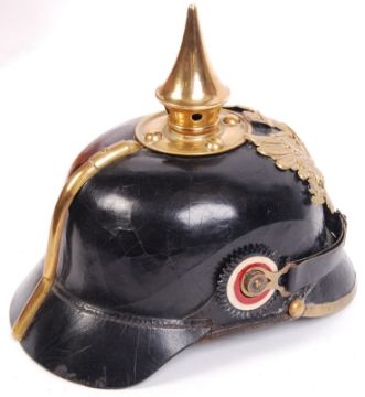 An original WWI First World War Imperial German Prussian Pickelhaube uniform helmet. Leather construction, with brass spike and eagle to front. Complete with original liner. Rare.