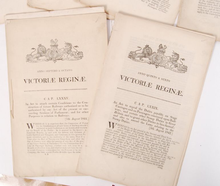 A collection of 5x 19th century Victorian Railway ' Acts ' / Laws. Comprising; 'an act for consolidating in One Act certain provisions usually inserted in Acts authorizing the making of Railways,' ' an act to restrict the Powers of selling or leasing Railways contained in certain Acts of Parliament relating to such Railways ' and others. Fascinating reading for Railway enthusiasts.