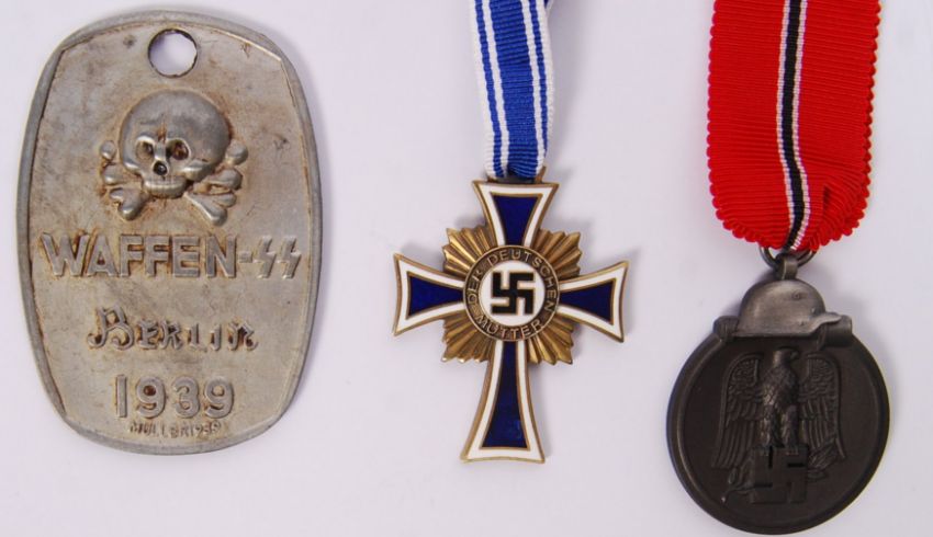Three reproduction Nazi German Third Reich medal / tags comprising of; Cross of Honour of the German Mother, with ribbon, Waffen SS Berlin 1939 tag & Eastern Front ( Winterschlacht Im Osten 1941 / 42 ) medal, with ribbon.