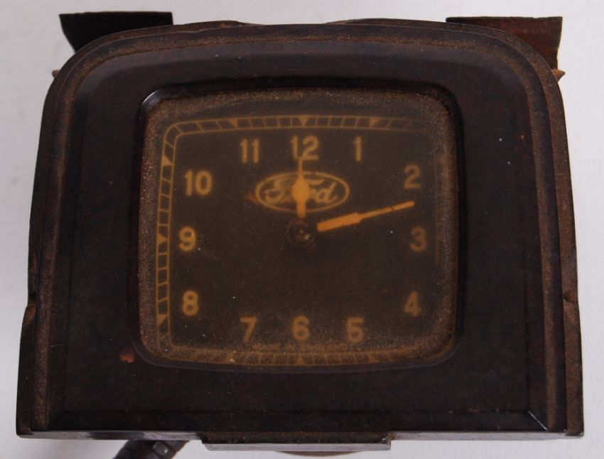 A rare vintage Ford Art Deco bakelite car dashboard clock. The dial marked ' Ford ' to centre, with a brown bakelite surround still present. Winder present, and the clock in working order. Rare. Measures approx; 8cm wide.