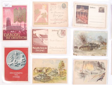 A collection of 10x original Nazi German Third Reich propaganda & picture postcards depicting & commemorating events such as;  tanks watercolour print postcards, 1936 Berlin Olympic Stadium with Berlin Olympia postal stamp, 1933 Nuremberg Rally, Reichspartei Tag postcard with medal, Panzer tank driving through Brunn & 1938 ' Ein Volk Ein Reich Ein Fuhrer ' ( One People, One Nation, One Leader ) postcard commemorating the union of Germany & Austria. Mainly all unused with some having handwritten material & postal stamps to reverse.