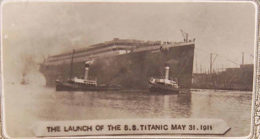 An incredibly rare SS Titanic real photo launch postcard. Depicting ' The Launch Of The SS Titanic, May 31st, 1911 '. The black and white photograph to the centre shows the freshly launched Titanic being pulled into harbour by tugs. Taken in Belfast, at Queen's Yard. A decorative floral border surmounts the central image. Measures approx 6"x4" total size. Very few of these postcards were thought to ever have been produced, and even less surviving. Only a handful of similar cards exist to this day - but this card shows a slightly different image to those known (the other type of card showing a different arrangement of tug boats at Titanic's hull). Possibly unique, possibly the only surviving version of this card. Handwritten to note to verso, presumed unrelated to the ship itself, reads ' 171 Eldon Road, Cardiff 24/11/11. Dear Cousin, I thank you very much for the flowers, afraid wife is no better. She is going under a operation. Sarah and her mother wish to be remembered to you. I hope your Father's better by now. Harry is home from sea. Kind love to all... Walter (?)' (sic).  The card remains in very good condition - with no rips, or major folds. Printed by J. Johnson, 24 William Street, Belfast. An incredibly rare example of a Titanic postcard. On Wednesday 31st May 1911 at 2:15pm, the RMS Titanic, owned by the White Star Line, was launched into the Victoria Channel in Belfast Lough from slipway number 3 at the Queen's Yard of the Harland & Wolff shipyard. The event was witnessed by 90 members of the press & crowds of over 100,000 people including dignitaries, dockers & members of the public. She took 62 seconds to travel the length of the slipway, at a speed of 12 knots before hitting the water. As to the tradition of White Star Line, Titanic was never christened, which some saw as a bad omen at the time. Just over a year after this image was taken, Titanic left Cherbourg (France) and steamed into the history books.