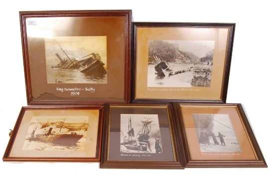 A collection of 5x vintage 19th & 20th century wooden framed photographs of wrecked & run aground ships to include; Harbour At Morning, circa 1880, Coal Tarring The Caulking, circa 1900, Caught On A Falling Tide On The Bristol Avon, 1857, King Cadwallon, Scilly, 1906 & other.