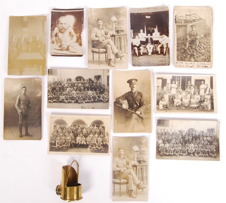 A collection of both First & Second World War items to include a Second World War small artillery shell trench art piece in the form of a coal scuttle. ' 1943 ' stamped to bottom. Measures approx 8cm tal, and a collection of First World War photographs of groups of soldiers, soldiers posing, Colonial man, group of men playing pool & others.