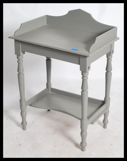A 20th century antique style painted shabby chic console table. Raised on turned supports with gallery edge table top and lower tier beneath. Measures: 85cm high x 61cm wide x 40cm deep.
