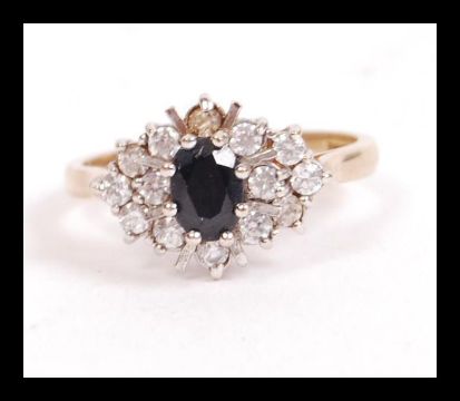 A hallmarked 9ct gold cluster ring set with a central blue sapphire surrounded by white stones. Hallmarked Birmingham. Weight 2.9g. Size M.