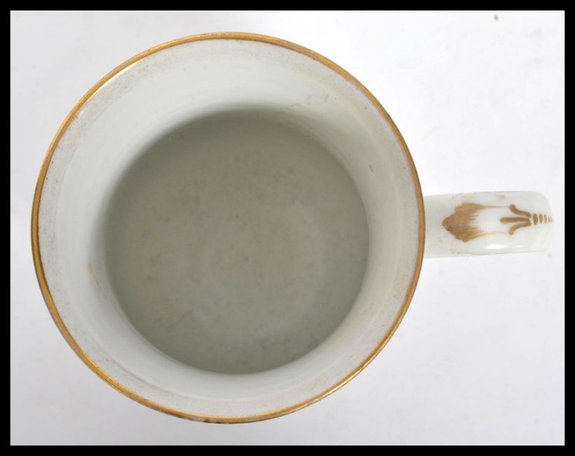 A Chelsea bell shape tankard hand painted with birds of paradise, gilt to the rim with anchor towards tjhe base. Early repair to handle. Measures 12 cm high.
