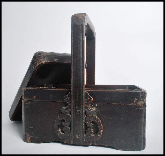 A 19th century Chinese ebonised carry / food box. Sectional interior, with decorative carved handle brackets.