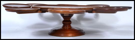 A 19th century Victorian mahogany and oak lazy Susan sectional serving plate having a revolving centre tray with multiple trays to the outer. 16cm tall x 73cm wide.