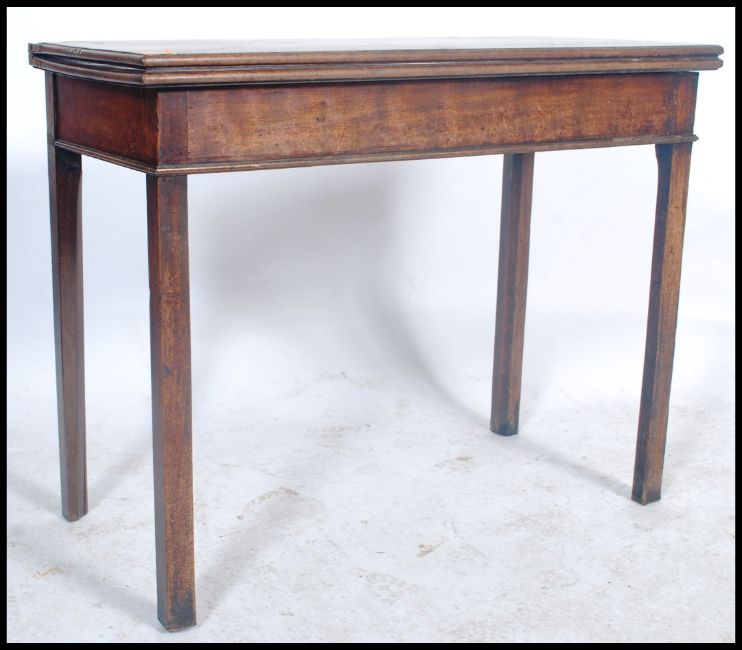 A 19th century Georgian mahogany card - games / tea table being raised on squared legs having a fitted frieze frame with hinged fold over table top. Measures 73cm x 90cm x45cm.