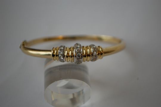 An 18ct gold and diamond bangle bracelet with white gold set round cut diamonds. Diamonds approx 30pts. Marked 18k 750 tests 18ct gold.  Weight 17.2g.