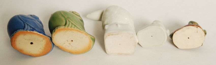 A group of Royal Doulton animals to include a pair of blue and green glazed scrolled birds , a plain white possibly prototype character bird Harry Simeon , and two bunny rabbits. (Marshall) Note; from an extensive private collection of Royal Doulton. The vast majority of items are free from any damage or restoration, and are in great condition. Buyers are reminded for the need to satisfy themselves as to condition of individual lots prior to bidding as condition on some, will vary.