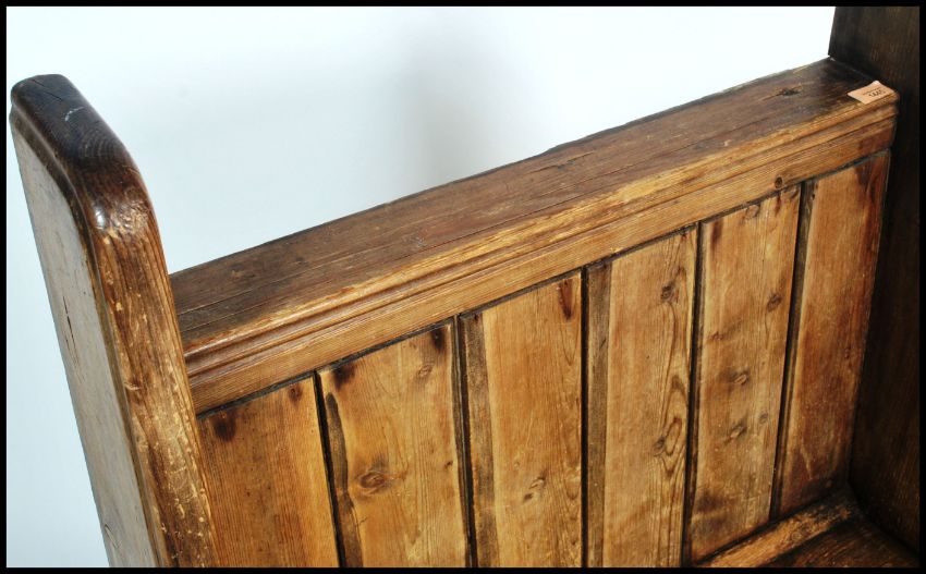 A good 19th century Victorian pine hall settle bench having pine slatted back rest with canted corned end supports and a central planked seat. Measures 105cm x 77cm x 54cm.