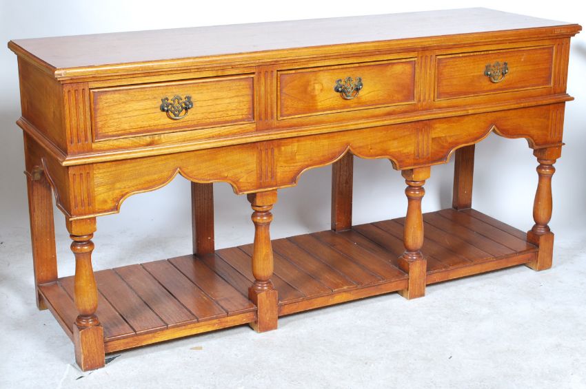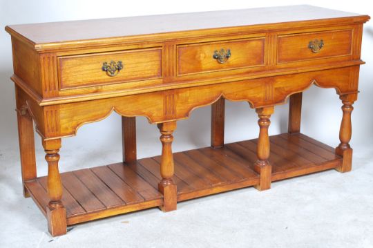 An excellent large  oak country dresser base of impressive size being raised on turned bulbous legs with lower pan tier.Above a fitted frieze with shaped apron having a series of single drawers beneath flared planked oak top above