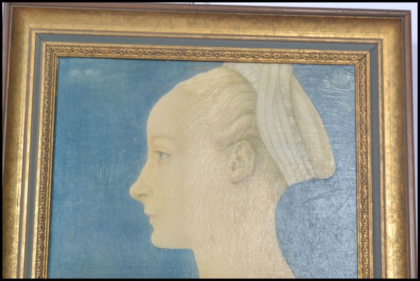 After Antonio Del Pollaiuolo 20th century Renaissance style oil on canvas print / Oleograph of a young lady facing left in traditional period dress. Set to an ornate gilt frame. Marked for Sweden.