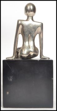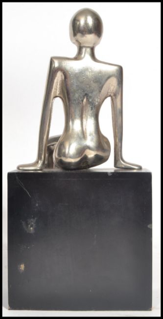 A vintage 20th century Art Deco chrome figurine of a lady raised on a ebonised wooden plinth base. Measures 25 cm high.