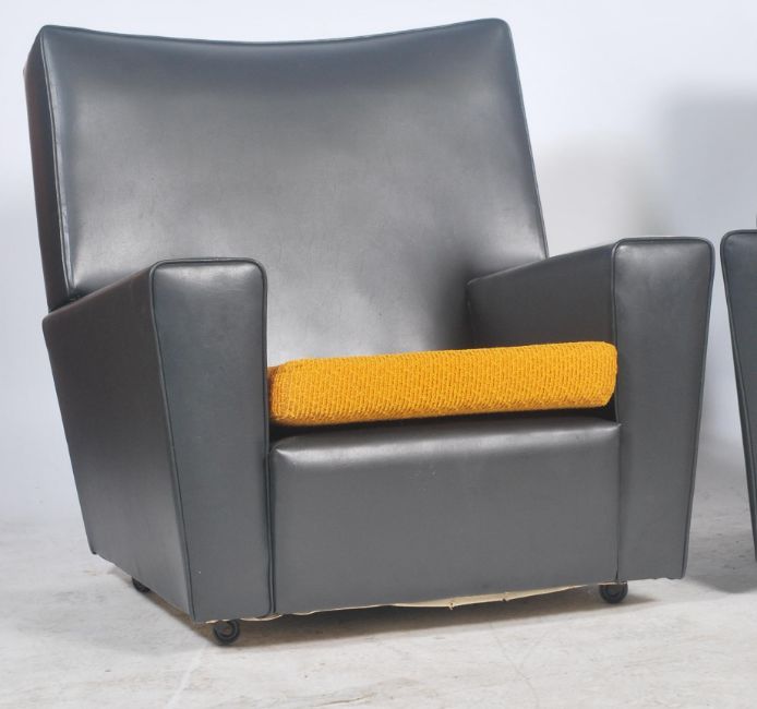 A retro 1960's 3 piece suite in two tone colourway. The excellent condition suite comprising a large 3 seat batwing sofa settee together with the 2 matching armchairs. Upholstered in black faux leather vinyl and original vivid orange wool upholstered cushions