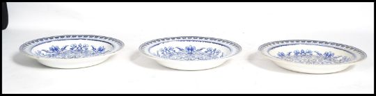 A group of four 19th century Victorian Brown-Westhead Moore & Co blue and white plates in the Teutonic' pattern. Stamps to base.