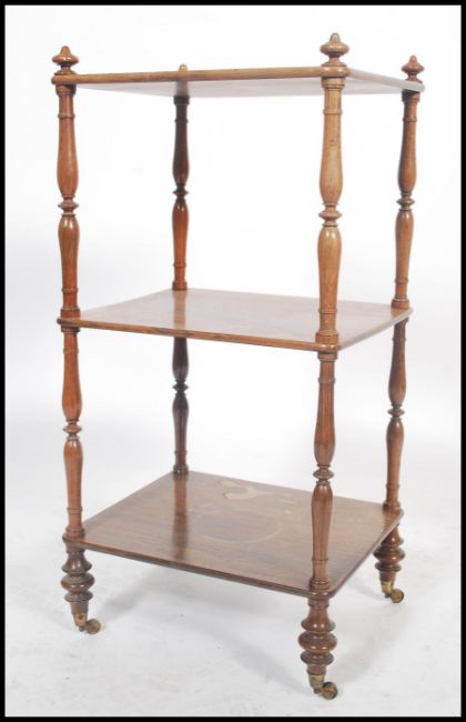 A Victorian walnut 3 tier etargere / whatnot being raised on cup and cover legs with brass cap castors having turned columns supporting three tiers. Measures 77cm x 39cm x 33cm.