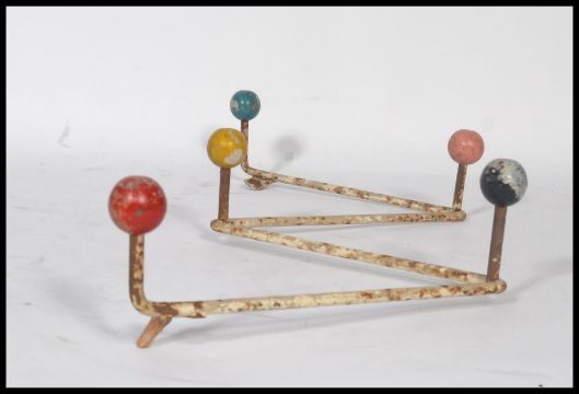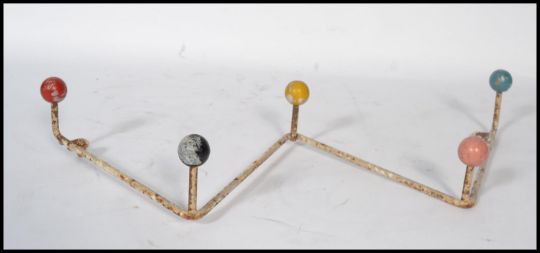 A vintage retro 20th century sputnik atomic set of coat hooks in a painted finish with multi coloured ball finial ends. Measures 50cm wide.