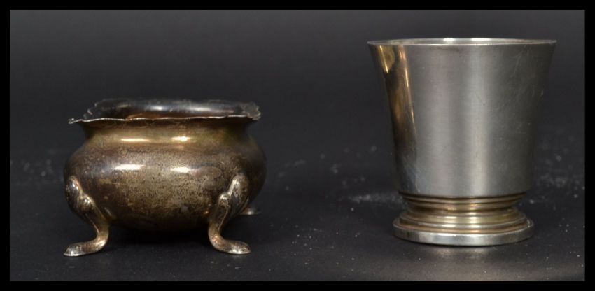 A 1940 Adie Bros of Birmingham silver hallmarked hunting beaker together with a VIctorian silver hallmarked table salt raised on pad feet having scalloped edge bowl. Hallmarked for 1850, Birmingham. Total weight 71.7g