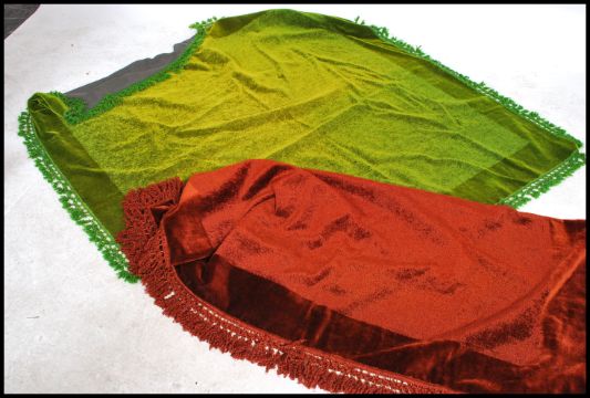 Two vintage 20th century cotton Chenille tablecloths in vibrant green and red colours having tassel ends. Also with a vintage 20th century floor woollen rug with bold geometric colours.