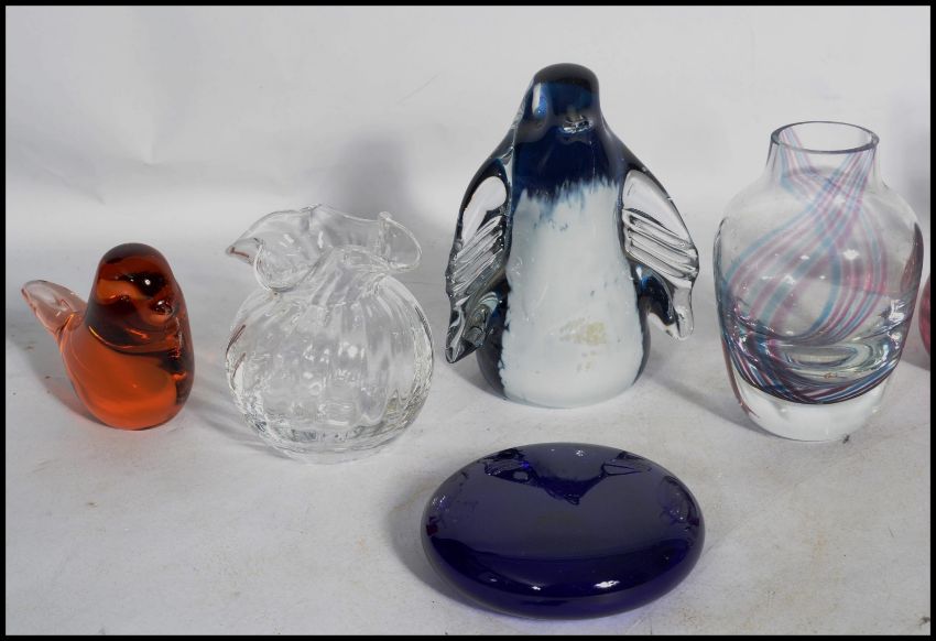 A group of vintage glass ware to include three silver collared cut glass scent bottles, Dartington , Caithness , Wedgwood bird paperweight etc. Highest measures 14.5 cm.