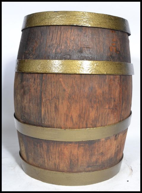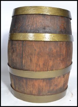 A vintage early 20th century point of sale / bar oak and four ring copper coopered drinks barrel. Measures 44cm high.